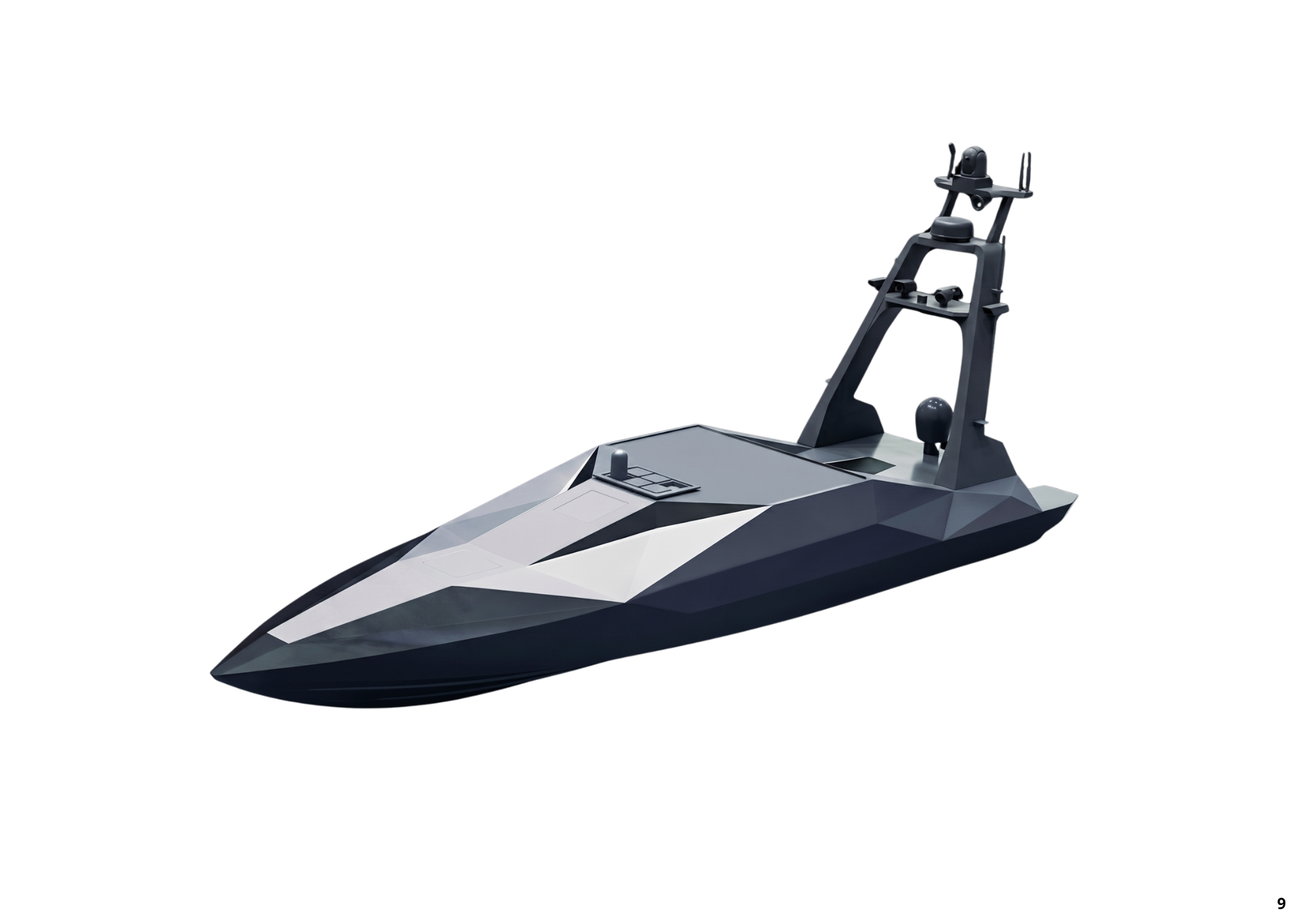 高速・高機動かつ安価な小型USV。全長5mクラスのコンパクトな船体は20ftコンテナに収容可能で、島嶼周辺や沿岸域への迅速な展開に対応する。量産を前提とした設計により調達コストを抑えつつ、自律航行モードを搭載し、遠隔監視下での長時間の無人運用を実現する。